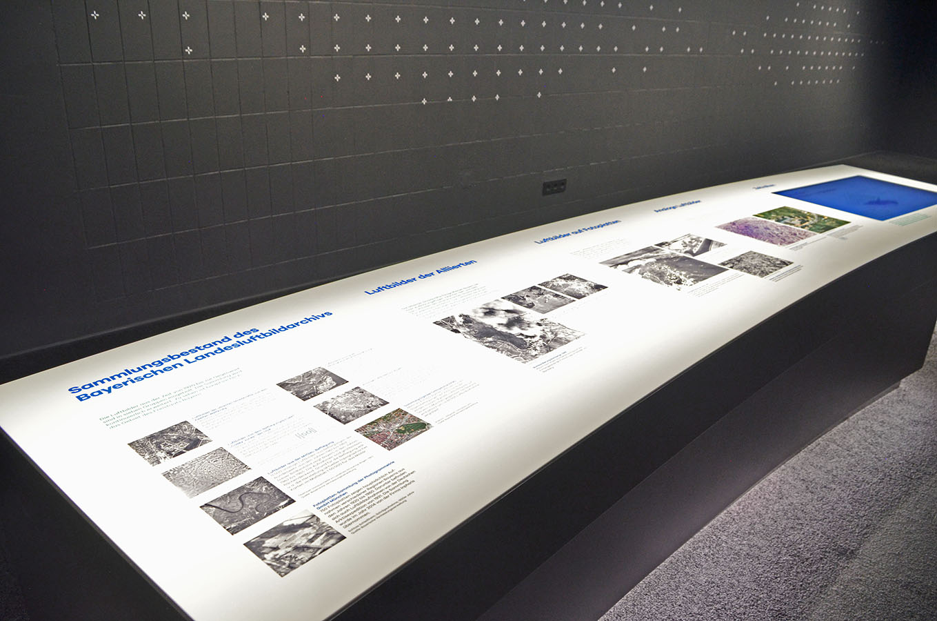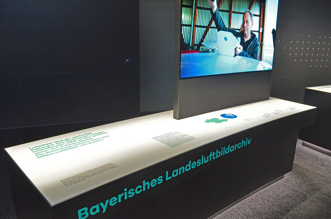 An der Recherchestation können Luftbilder aus ganz Bayern aufgerufen werden. Dabei werden Veränderungen von Landschaften und Städten gut sichtbar. Ein virtueller Flug über die Zugspitze, der Blick durch eine Anaglyphenbrille oder durch ein Stereoskop machen deutlich, wie Gebäude und Landschaften in Luftbildern zu dreidimensionalen Objekten werden.