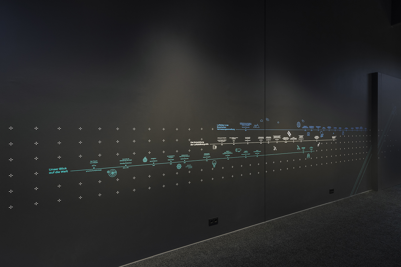 Im Zentrum der Ausstellung leuchtet der Nukleus mit einer riesigen Luftbildkarte. Diese Karte ist 18 Meter lang und kann virtuell erkundet werden. Im Inneren des Nukleus werden Luftbilder aus einem Zeitraum von über 100 Jahren gezeigt.